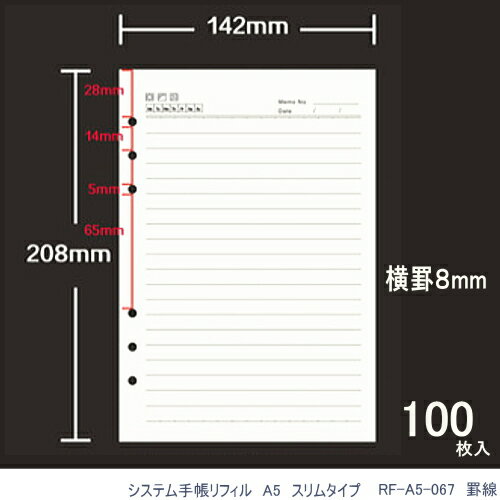 商品名 システム手帳リフィルA5 罫線 品番 RF-A5-067 サイズ 横142×縦208mm 仕様 70枚入 横罫8mm クリーム色用紙 A5サイズ、デスクサイズ 6穴 システム手帳に対応します。