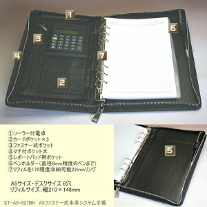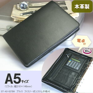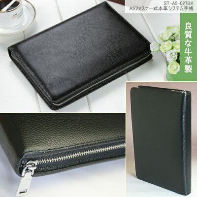 人気のファスナー式システム手帳 A5サイズ6穴 黒 本革製