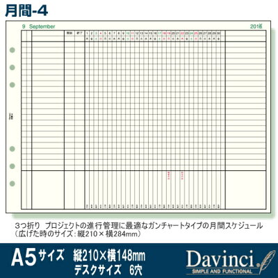 商品名 2020年月間-4 Davinci ダ・ヴィンチ A5サイズ システム手帳 リフィル (レフィル・レフィール) 品番 DAR2043(旧品番 DAR1943) サイズ 横280×縦210mm(A5サイズ、デスクサイズ 6穴)横148×縦210mm *二つ折り 入数 16ヶ月分 2020年1月〜2021年4月 仕様 プロジェクトの進行管理に最適なガンチャートタイプの月間スケジュール メーカー 株式会社 レイメイ藤井 日付入リフィル。